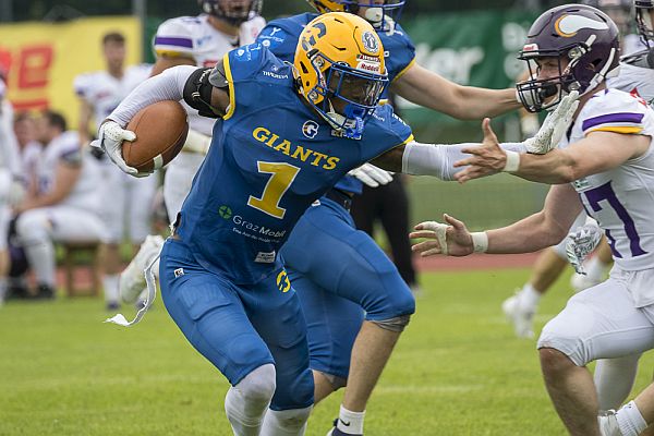 Die AFC Vienna Vikings mussten in der neunten Austrian Football League-Runde die erste Niederlage hinnehmen, verloren das Topspiel Samstagnachmittag bei den Thalheim Graz Giants 13:14. Beide Teams können längst nicht mehr aus den Top-2 rutschen, werden daher im Halbfinale Heimvorteil genießen. Titelverteidiger Danube Dragons ist nach einem souveränen 42:21-Heimsieg über die Salzburg Ducks voll auf Playoff-Kurs. Das trifft auch auf die Prague Black Panthers zu. Sie gewannen das Abendspiel bei den Rangers Mödling 33:0. Am Sonntag um 18 Uhr kommt es zum Derby zwischen Swarco Raiders Tirol und Schlusslicht Telfs Patriots.
